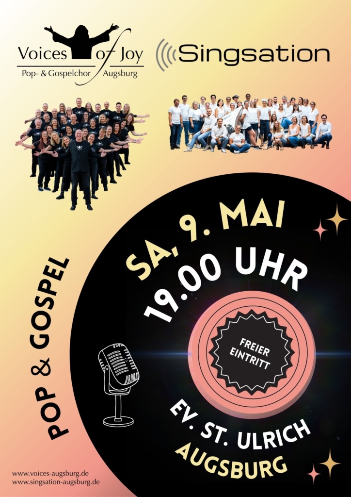 Am 9. Mai, 19:00 Uhr, geben wir ein gemeinsames Konzert mit Voices of Joy in Ev. St. Ulrich (Augsburg Innenstadt).